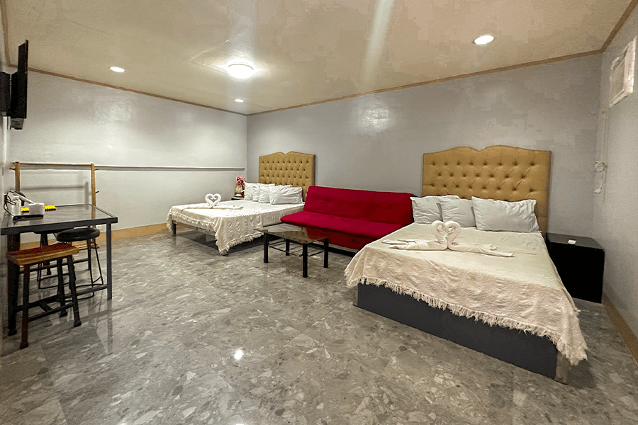• Room with 2 Double Beds and 1 Sofa Bed.
